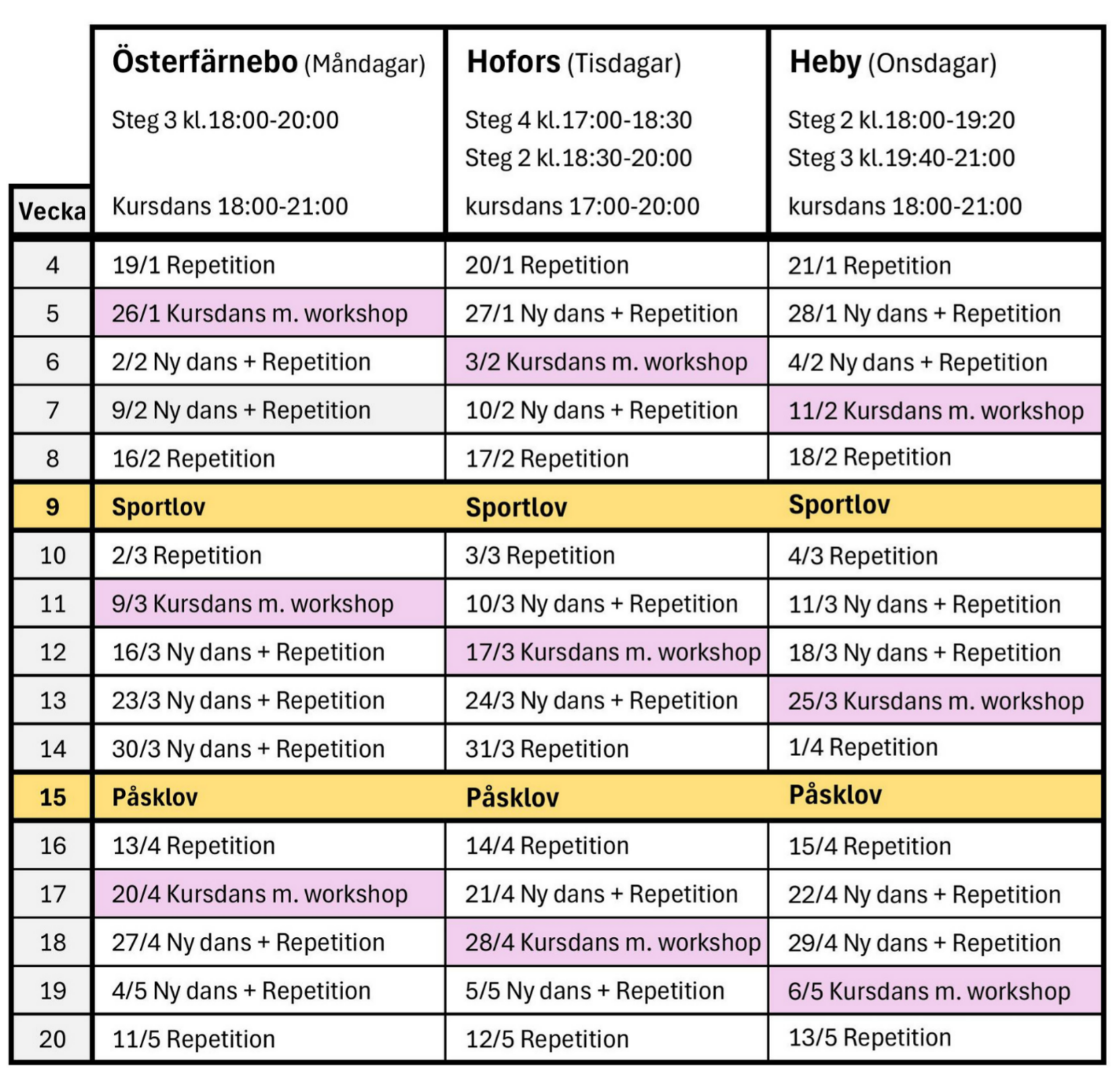 Du hittar uppdaterade tider och platser för våra kurser på de olika dansorterna, information om kurstillfällen med kursdanser, lov och ledigheter samt veckoplanering med kommande danser och repetitionstillfällen.